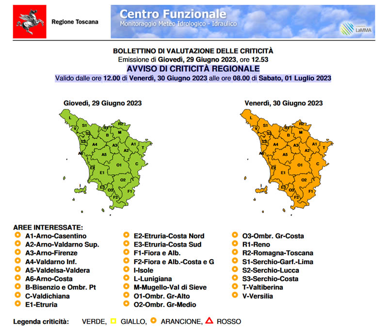 AVVISO DI CRITICITÀ REGIONALE Valido dalle ore 12.00 di Venerdì, 30 Giugno 2023 alle ore 08.00 di Sabato, 01 Luglio 2023.